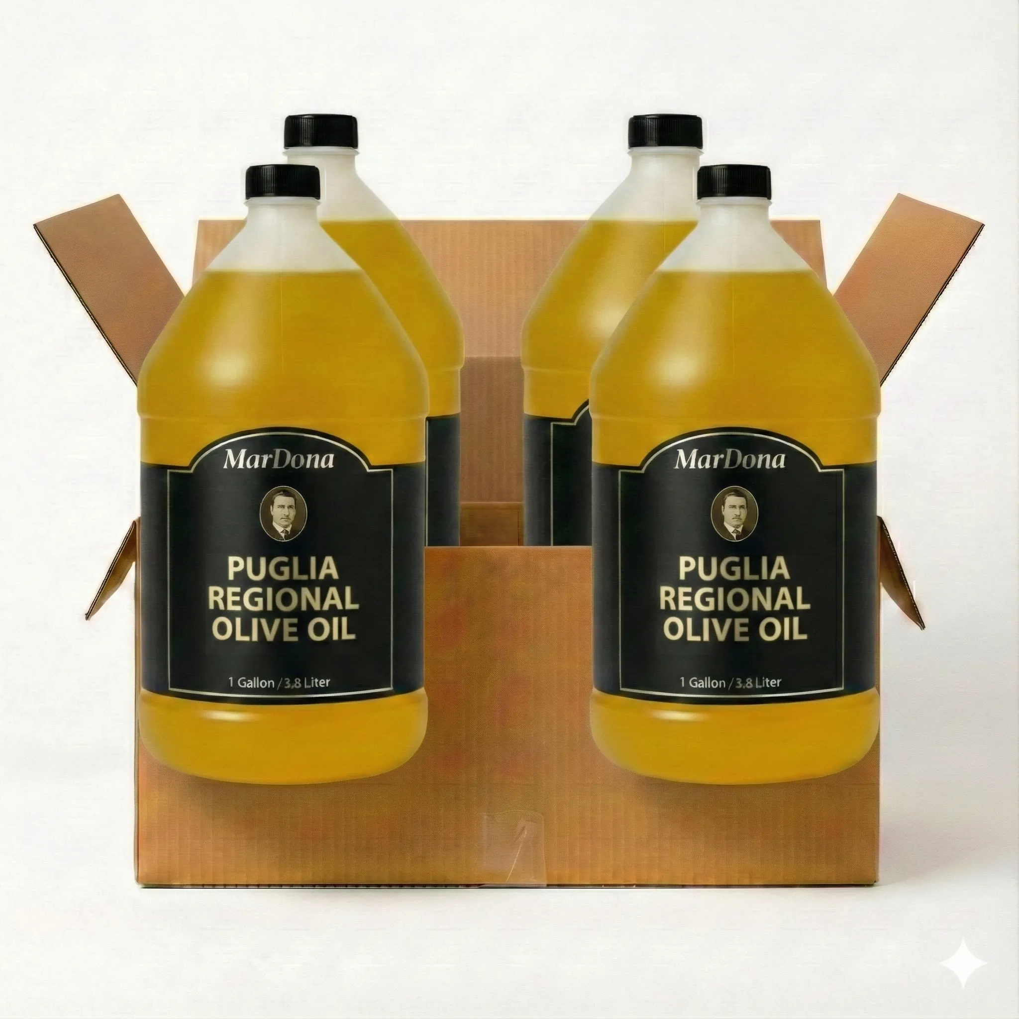 A bulk case of four 1-gallon bottles of Puglia Regional EVOO. A staple for professional Italian kitchens requiring authentic regional flavor.