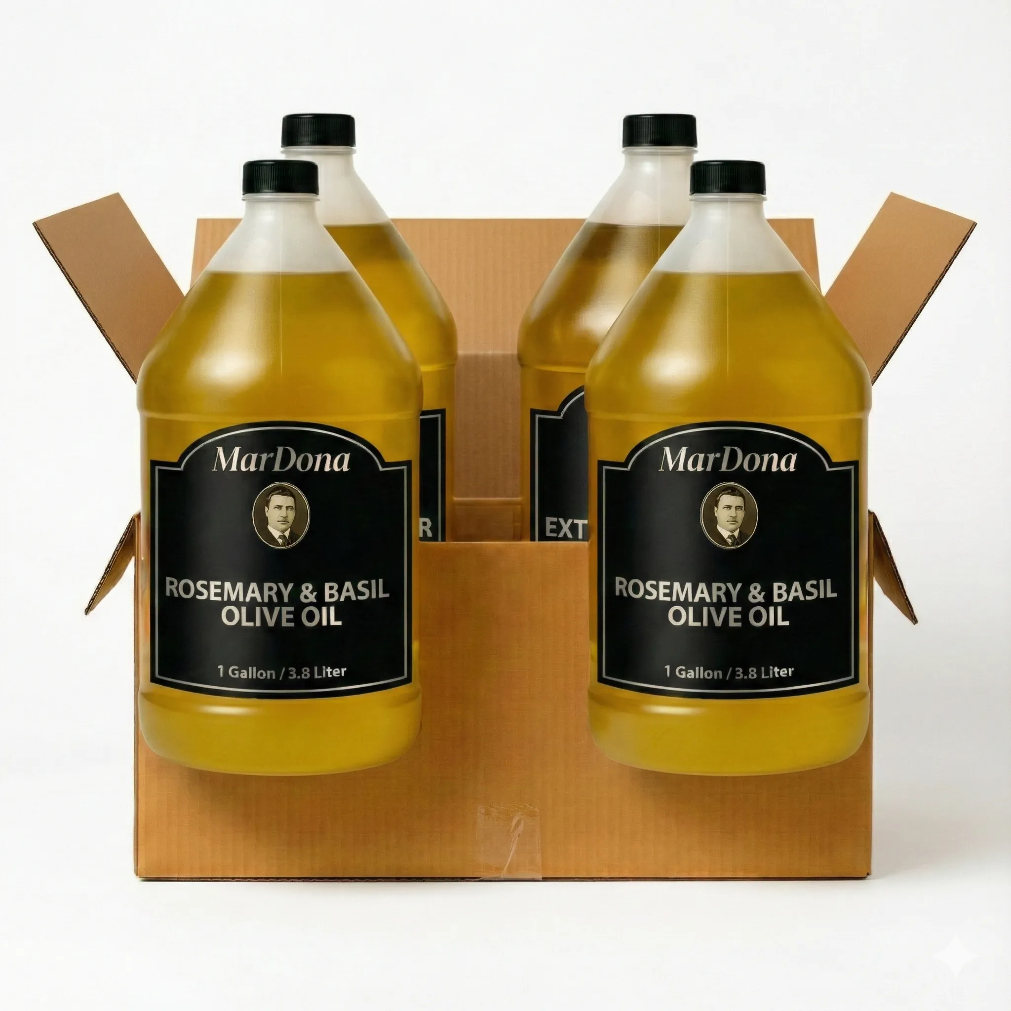 A bulk case of four 1-gallon bottles of Rosemary/Basil Olive Oil. A versatile dual-herb oil for efficient large-scale cooking.